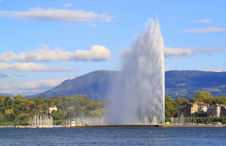 تقوم نافورة جنيف بضخ المياه في الهواء حتى تصل إلى 140 متر. ويمكنك التمتع بهذه النافورة أثناء الإسترخاء خلال النهار، أوالتمتع بها خلال الليل عندما تتناثر الأضواء الملونة حولها، كما يمكن رؤية هذه النافورة من على حافة بحيرة جنيف.
