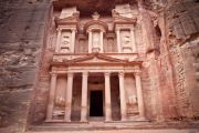 مدينة البتراء منحوتة في الجبال و تمتاز صخورها بألوانها الوردية، و قد تم بناء المدينة منذ ألفي عام على يد العرب الأوائل "الأنباط" في موقع كان سابقا مكانا لاستراحة القوافل التي تحمل الحرير من الصين، و البهارات و الحجارة الكريمة من الهند، متجهة للغرب.