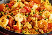 طبق شهي من المعكرونة التي تُصنع من دقيق الأرز ويوضع فوقها صوص سرطان البحر، بيض، جمبري، ثوم، حبار، وخضار مع عصير الليمون المنعش.